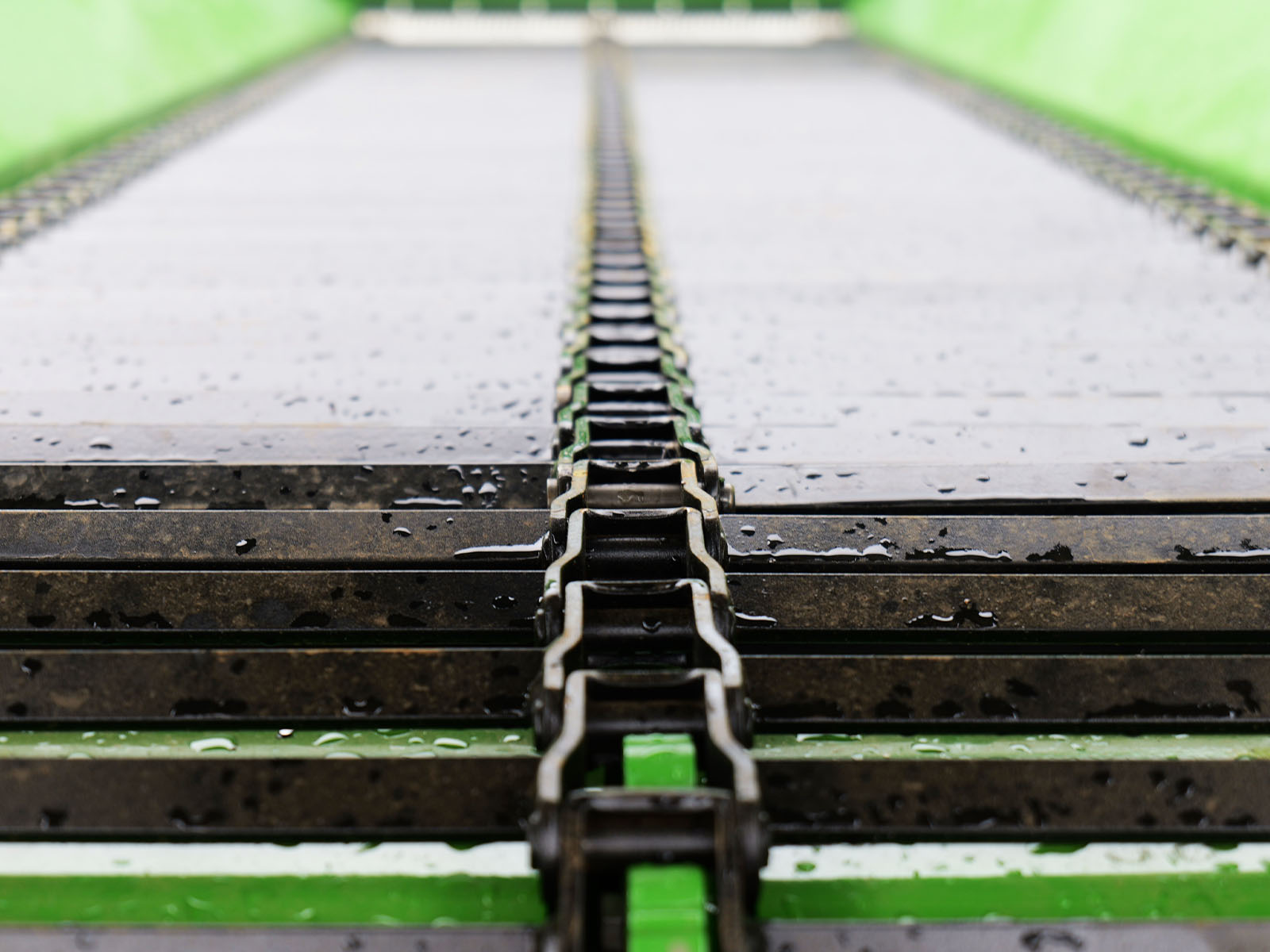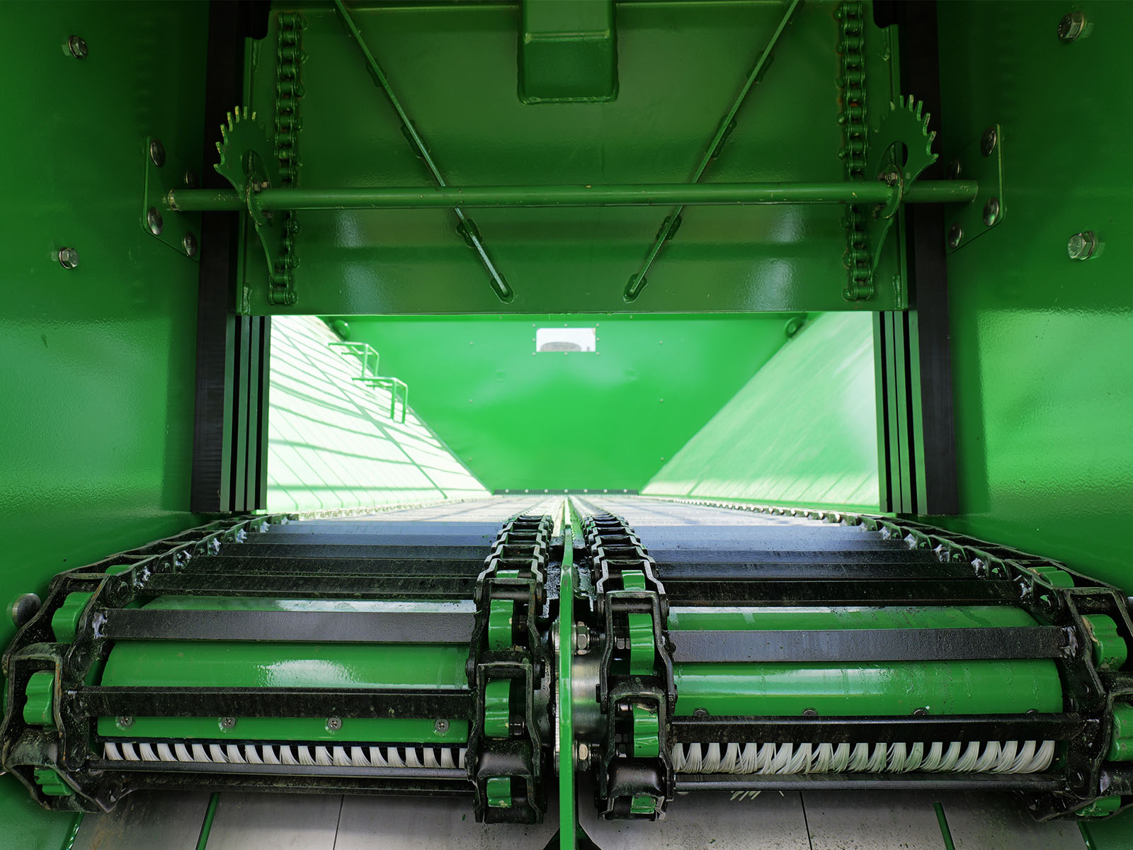 Napęd taśmy od koła ostrogowego gwarantuje, że podawanie materiału jest zawsze zsynchronizowane z prędkością jazdy