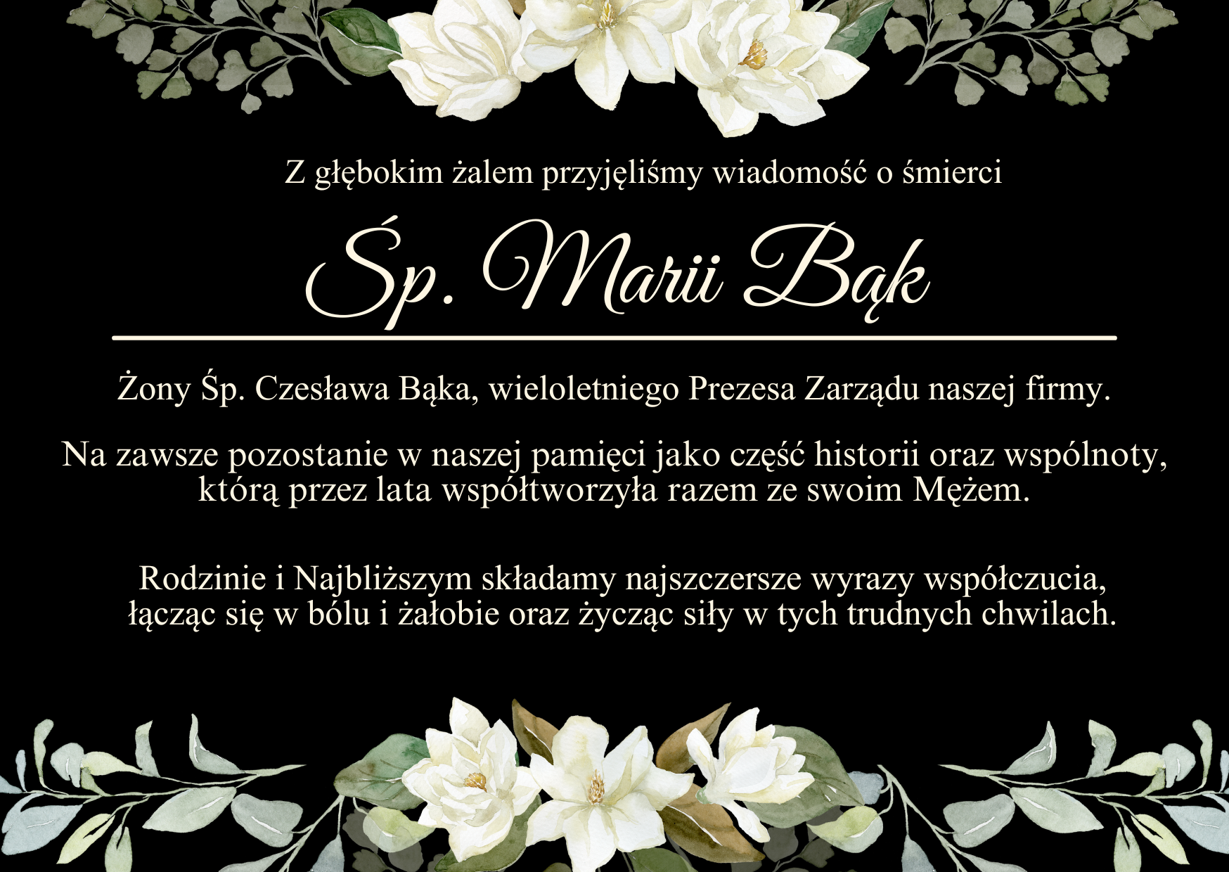 Żony Śp. Czesława Bąka, wieloletniego Prezesa Zarządu naszej firmy.